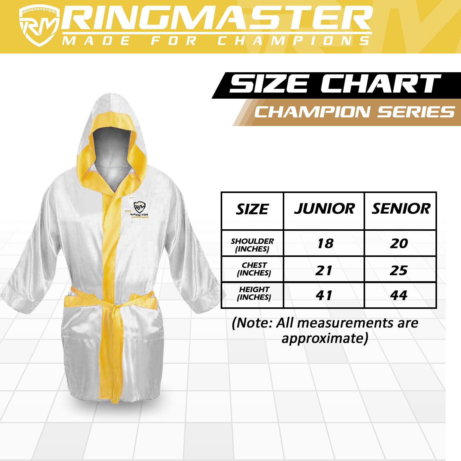 • Introducing RingMaster Sports brand new Champion Series Boxing Robes made of lightweight 100% Satin material.