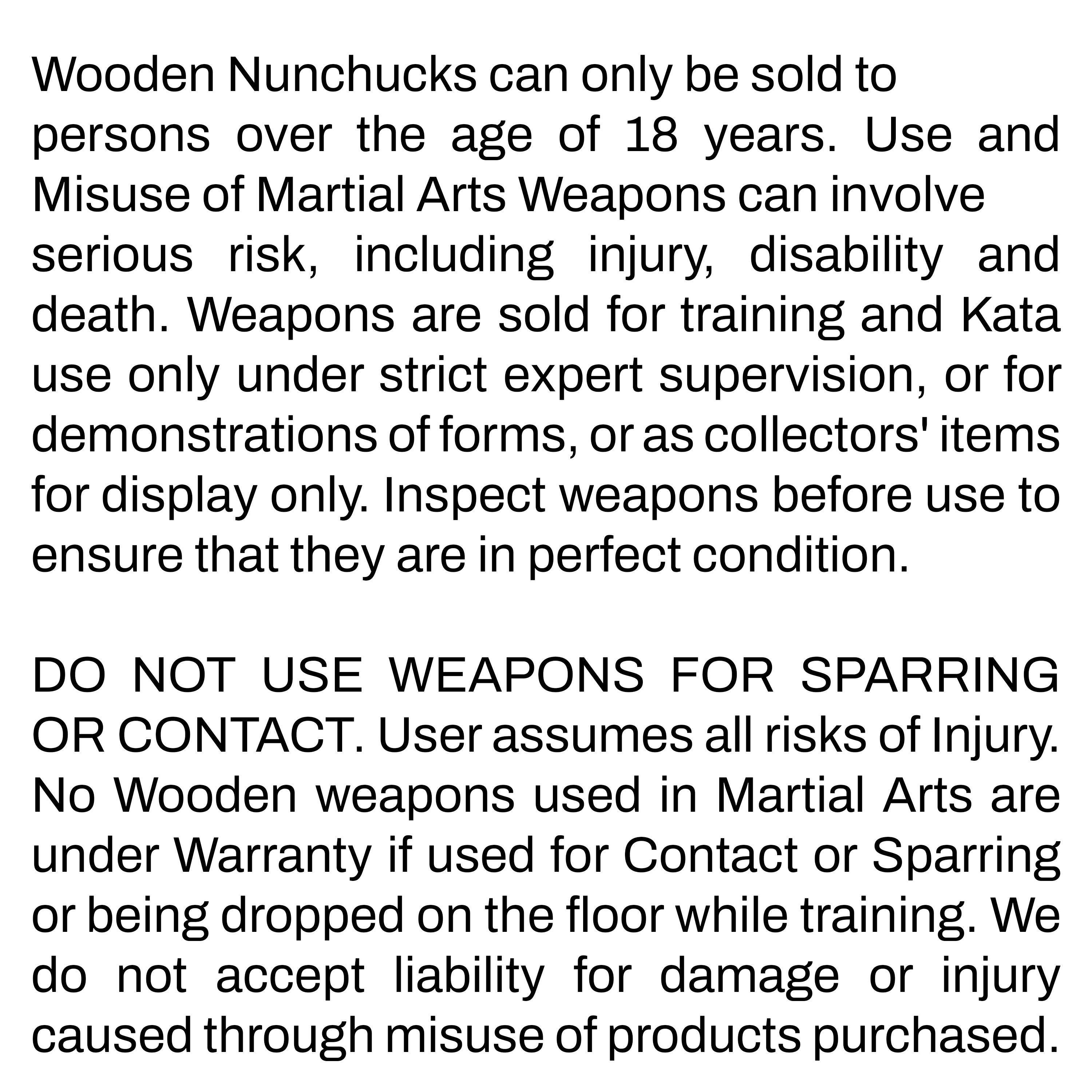 Wooden Nunchucks can only be sold to persons over the age of 18 years. Use and Misuse of Martial Arts Weapons can involve serious risk, including injury, disability and death. Weapons are sold for training and Kata use only under strict expert supervision, or for demonstrations of forms, or as collectors' items for display only. Inspect weapons before use to ensure that they are in perfect condition. DO NOT USE WEAPONS FOR SPARRING OR CONTACT. User assumes all risks of Injury. No Wooden weapons used in Martial Arts are under Warranty if used for Contact or Sparring or being dropped on the floor while training. We do not accept liability for damage or injury caused through misuse of products purchased.
